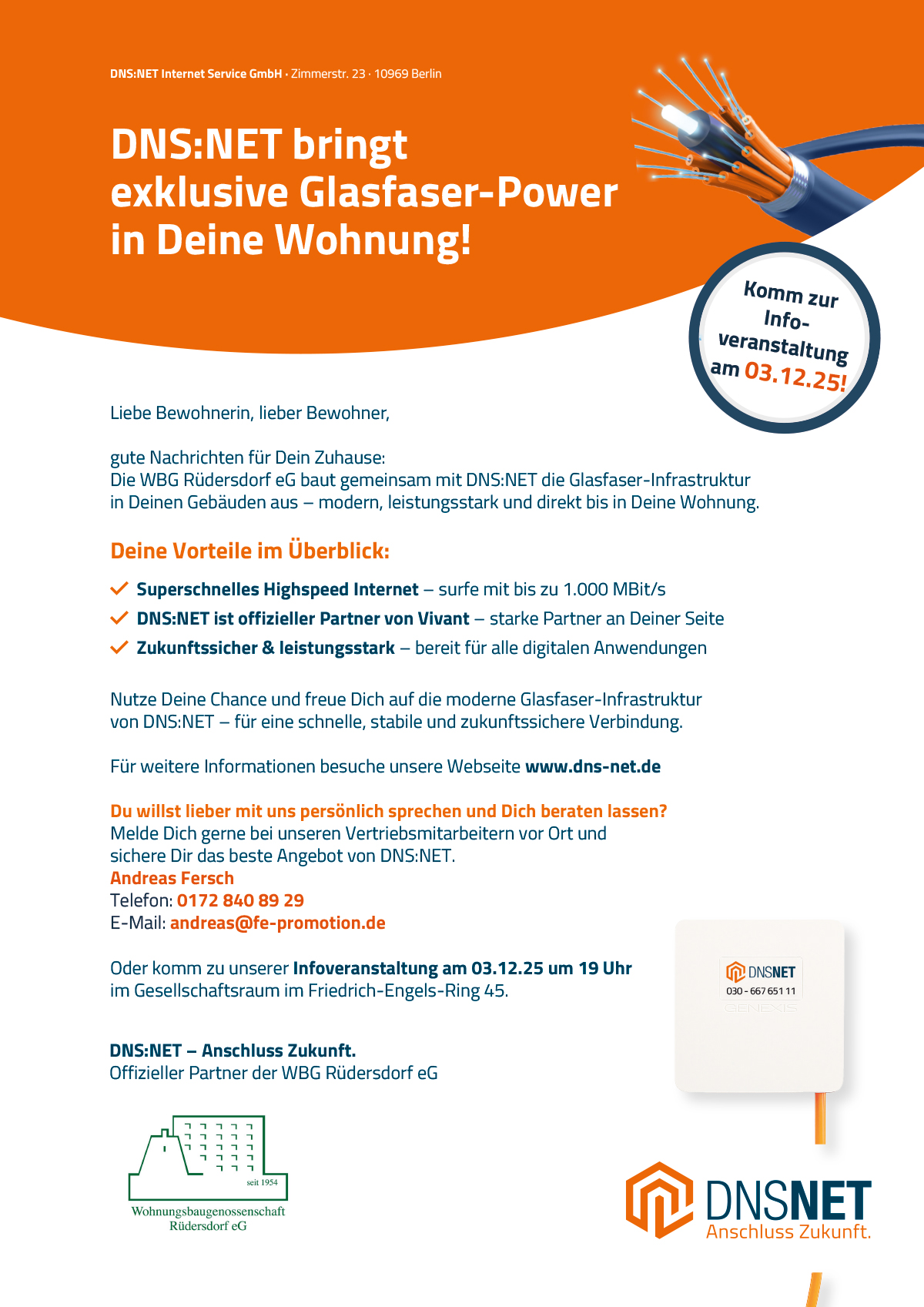 Die Firma DNS:NET wird zu den möglichen Glasfaservertragsangeboten in 2026 Informationsveranstaltungen in unserem Gesellschaftsraum im Friedrich-Engels-Ring durchführen.
