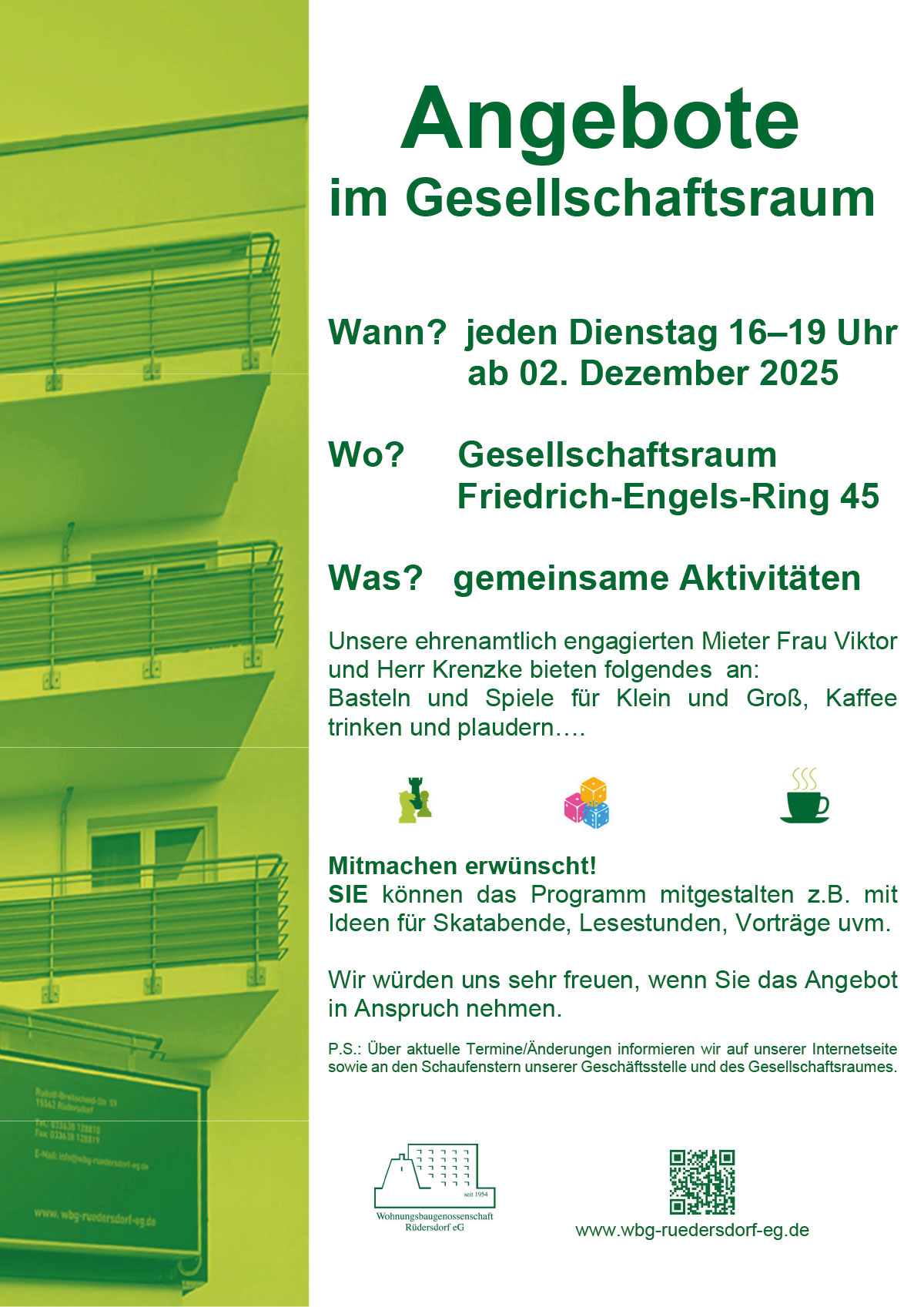 Tel.: 033638 128810Fax: 033638 128819 E-Mail: info@wbg-ruedersdorf-eg.deSprechzeiten Di. 08-12 Uhr + 13-18 Uhr Do. 08-12 Uhr